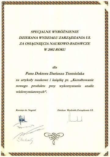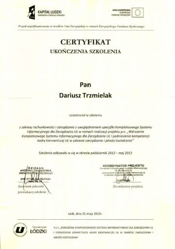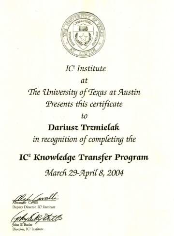 - Ukończyłem równiez szkolenie dla dyrektorów w Instytucie Innovation Creativity and Capital Uniwerstytetu Teksańskiego w Austin, gdzie uzyskałem certyfikat Instytutu jako specjalista z zakresu transferu wiedzy i technologii.